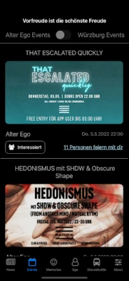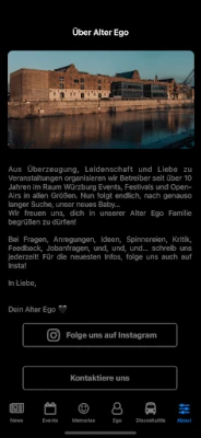 Dein Alter Ego wartet auf deinen Download. In dieser App erhaltet ihr Infos über anstehende Events in Würzburg, habt Zugriff auf die Partybilder und erfahrt alle News. Don't miss out, denn wer die App hat, erhält immer wieder Gutscheine, freie Eintritte und sonstige Specials...