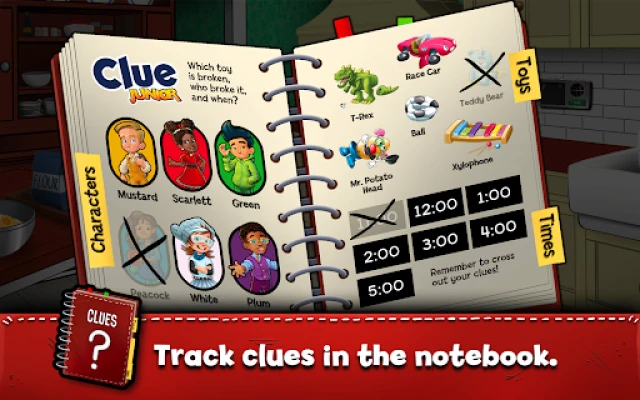 Uh Oh! Someone broke one of the toys! It's up to you to uncover which toy is broken, who broke it, and whenthey did it! The classic children’s mystery game by Hasbro is now an interactive, educational experience for kids. In this CLUE Junior app by PlayDate Digital, you are on a mission to explore the mansion as you interact with the iconic cast of colorful characters. As you find clues, you must eliminate choices and eventually you will discover what happened. Enjoy the dialogue and listen for hints voiced by each character.