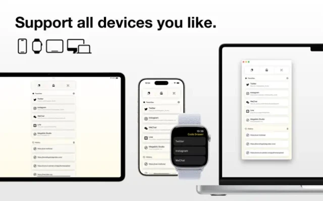 Have you ever found that every time you want to share your SNS account, you always have to search for QR codes for a long time? Why not save them to a single place? With Code Drawer, you can show the exact QR code you want immediately.