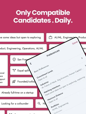 * Dual-Sided Compatibility: We focus on quality connections by recommending candidates who not only meet each other’s requirements but also share a passion for startup innovation. This approach increases the odds of forming a strong team, whether you’re an entrepreneur, founder, or investor.