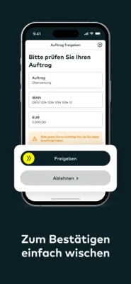 Sie führen eine Transaktion in einer anderen comdirect-App durch. Im Freigabe-Prozess für Ihre Transaktion öffnet sich automatisch die photoTAN App. Bestätigen Sie Ihren Auftrag, indem Sie den Pfeil von links nach rechts schieben.