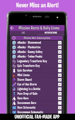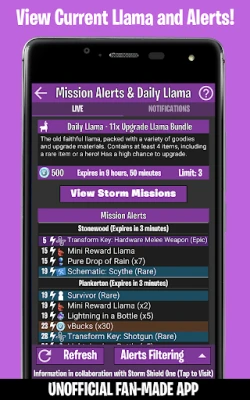 ★Daily Llama and Mission Alerts: Get up to date information about current Mission Alerts and Daily Llamas on your device. The mission tracker shows Alert, Storm and Group missions, including type and rewards.