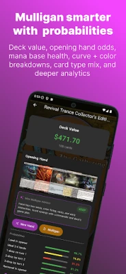 • Opening-hand probabilities and deck breakdowns (curve, colour distribution, mana health, card types)