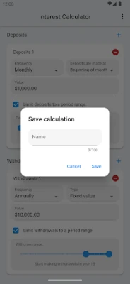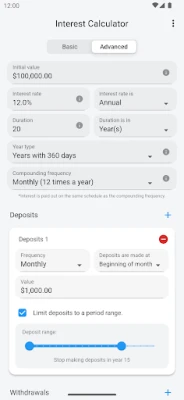 For more customization, the 'Advanced Mode' offers additional features: You can add multiple deposits and withdrawals over time, choose different compounding frequencies (such as daily or quarterly), and adjust the number of days in a year. For example, you can simulate a scenario where you make significant monthly deposits for 30 years, and then begin making annual withdrawals of a percentage of the balance. This calculator is that flexible.