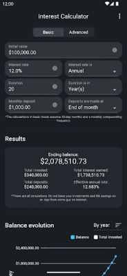 Getting started with the "Basic Mode" is easy: Just input the initial amount of money (if any), an optional monthly deposit, the interest rate and how much time you are planing to keep your capital invested. This app will then show you all the information you need in a beautiful graph, accompanied by a detailed analysis for the selected period.