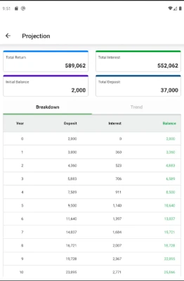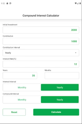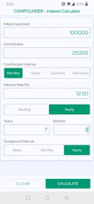 Interest calculator / compound calculator / Compound interest calculator application helps to analyse the growth of your investments based on the inputs you provide in the form of initial investment, contributions, interest rate, Compounding frequency etc.It provides an easy to follow yearly breakdown of your investment growth and balance.