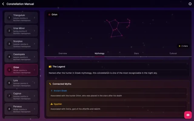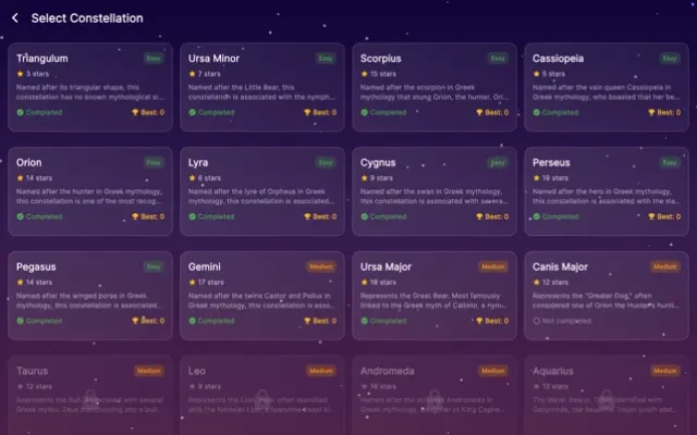 • Trace stars to recreate constellations from around the world • Progress through challenging levels from Triangulum to Orion • Use power‑ups to help with tricky patterns and build score combos • Immerse yourself in stunning visuals and a calming soundtrack • Learn fascinating constellation stories and astronomy facts • Multiple modes: Relax, Challenge, and Expert