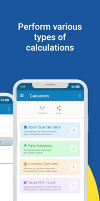 Room Size, Concrete and Paint Calculators allow to estimate: