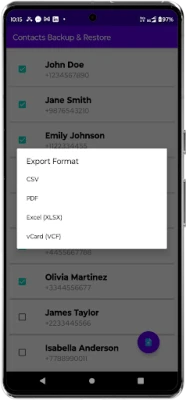 Available formats: Excel, PDF, CSV, or VCard (VCF).