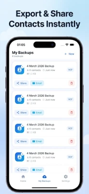 Create a full backup of all your contacts instantly. The app saves your contacts in a secure .VCF (vCard) file, which is supported by Android, iPhone, and most contact management apps.