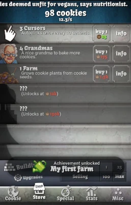 • Tap to make cookies, then buy things that make cookies for you. Then tap some more! • Hundreds of upgrades and achievements to unlock. • The game continues while your phone is closed, so you can set up your ideal bakery and resume later to reap the delicious profits! • Lovingly-crafted pixel art and flavor text! • Ascend to gain permanent transcendental upgrades! • Beware the grandmas!