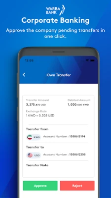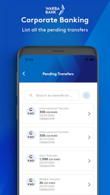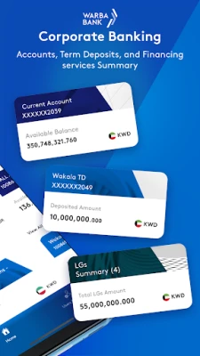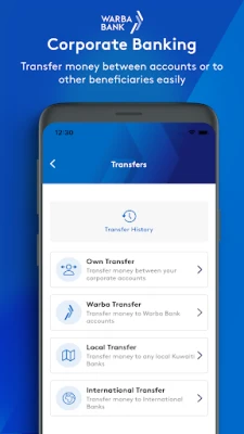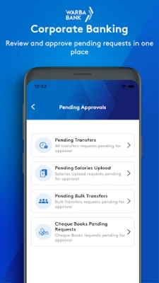 ntroducing the new Corporate Banking mobile application for the first time in Warba Bank where the customer will be able to login to his corporate online banking account easily, anytime and anywhere through our application that will be available on mobile and tablet version in both Arabic and English languages