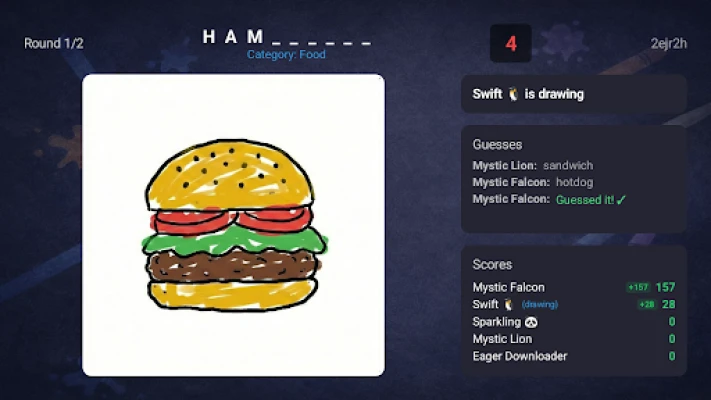 Perfect for parties, game nights, or casual fun. The TV displays the drawings and leaderboard while the drawer sketches on their phone and guessers type answers on theirs.