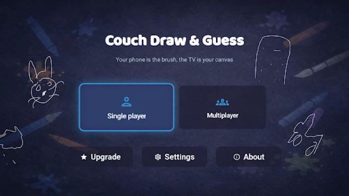 Couch Draw & Guess brings the fun of Pictionary-style drawing games to your living room. Start a game on your Android TV, share the 6-character room code, and friends can instantly join from their phones — no app download needed. One player draws on their phone, everyone watches the TV, and players guess from their phones.