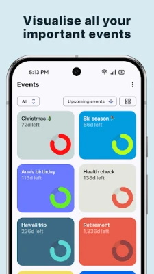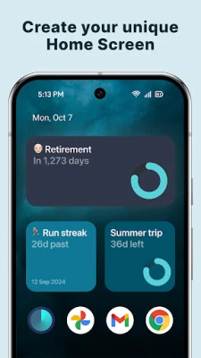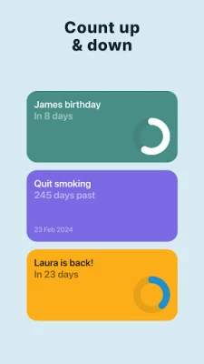 Count how many days until significant events with Pretty Progress count-up and countdown widget. A birthday countdown widget, a day tracker for quitting alcohol, or knowing the time left until a deadline – keep the motivation with ALWAYS ON reminders on your Home Screen.