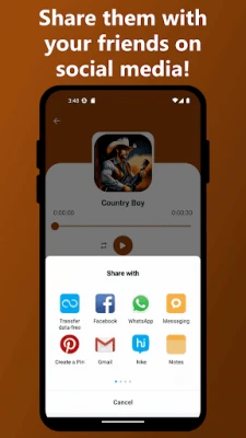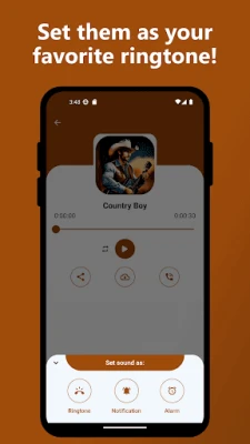 Country Music Ringtones is easy to use. Just tap once to listen to the sound and hold to set it as your ringtone, alarm, notification, or contact sound. You can also download the sound to your phone or share it with your friends on social media.