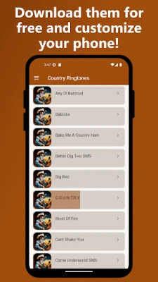 Country Music Ringtones is a free app that offers you a selection of the most popular country songs ringtones and sounds for your phone. You can use them as your ringtone, alarm, notification, or contact sound. You can also download them and share them with your friends on social media.