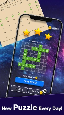 Solve the puzzle and share your progress with friends, win collectable coins for each wordly you solve and show your friends your statistics!