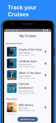 CruisePicker helps you get excited for your cruise with beautiful countdown widgets that include your ship, cruise line and how many days to go. Customize the widget by choosing from gorgeous vacation photos and add custom text. Also, collect all your past and upcoming cruises in the app's MyCruises screen.