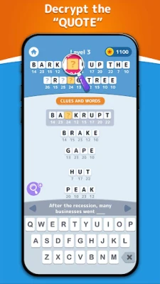 In this game, you crack the code, connect the correct letters, and complete the decoding process of quotes using clues. You need to use your logic skills to hunt for hidden letters in clues and words that have associations to decipher each quote. Decrypt hidden quotes in numerous challenging puzzles and become the crypto master.