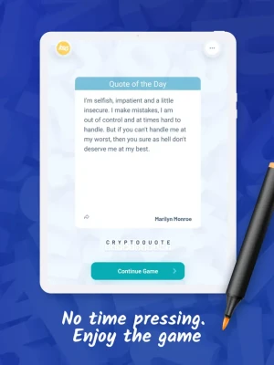 The Cryptoquote: quote cryptogram app is designed for those who enjoy logic word games. It contains a huge volume of fascinating quotes by famous (and less famous) people for you to decode phrases like a serious cryptoquip solver. Each quote is encrypted and needs to be solved by matching letters with corresponding numbers in the cryptogram. The Cryptoquote game has a simple, clean, and very convenient interface that will let you play for hours with no distractions. The main purpose of the game is to provide you with a relaxing gaming experience and boost your logic skills. Game features: