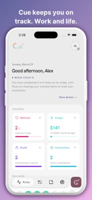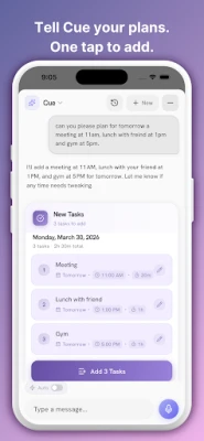 Cue AI is your AI coach, planner, and personal assistant that turns your to-do list into a flexible daily schedule. Just type (or talk) in plain language and Cue helps you plan your day, build habits, and stay on track when life changes.