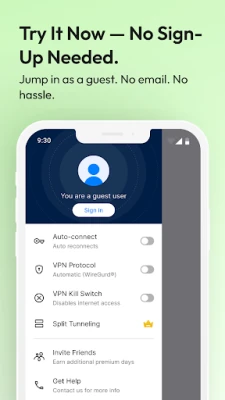 Connect instantly with one tap. No account, no email, no phone number. Perfect for users who want instant privacy without friction.