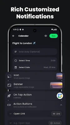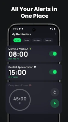 Set one-time reminders, weekly routines, or countdown timers in seconds. Add custom icons, banner images, sounds, vibration, and other advanced notification options to make each reminder easier to notice and act on.