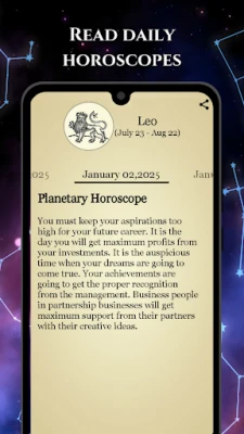 In addition to providing horoscopes, our app also provides a comprehensive planetary horoscope, information about your element, traits, lucky color, lucky day, compatibility with other signs, and other features.