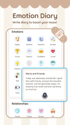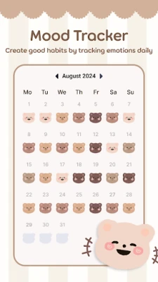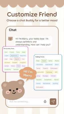 Feeling tired or need someone to listen? The Chat with Buddy feature connects you with Buddy the bear for mental health care and support. You can choose your friend's personality traits and tone of voice to talk. This compassionate friend offers advice and encouragement to help you manage stress and mental health issues. Chat with Buddy for daily support, enhancing your mental health mood tracker experience.