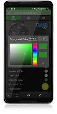 ✔ Color picker to select any color you like for the background, clock hands, text, & numbers