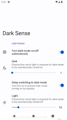 Dark Sense is an app that runs in the background and automatically switches to dark mode/theme when your device's light sensor detects low light levels, and switches to light mode/theme when your device's light sensor detects high light levels.