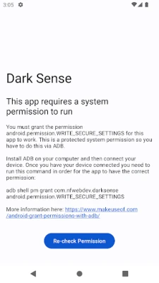 How it works: 1. Connect your phone to ADB and run the command "adb shell pm grant com.nfwebdev.darksense android.permission.WRITE_SECURE_SETTINGS" 2. That's it! The app will automatically run in the background monitoring the lighting levels of your device's environment.