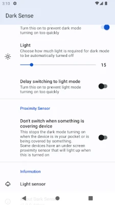 You can choose at what point dark mode should turn on and at what point light mode should turn on, plus more options in Dark Sense settings.