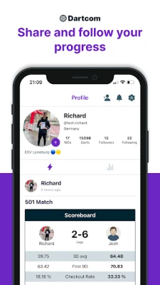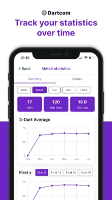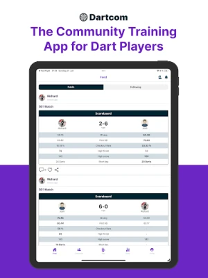 Whether beginner or pro: With Dartcom, you can train, track your games, and connect with players around the world. Play training games, share your achievements, and follow your progress – all in one app.