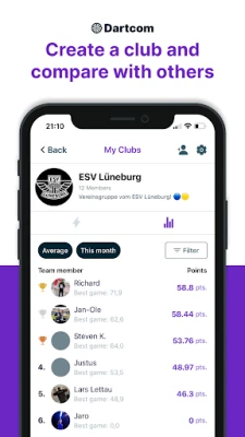 - Clubs & teams: Create a team or join a club. Compare averages, 180s, short legs, and more.