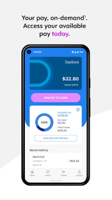 Experience the power of spending or managing your money as soon as you earn it. Dayforce Wallet gives you on-demand access¹ to your available pay without charging you any interest or monthly fees. Use the app to add your available pay to the Dayforce Wallet Mastercard® at the end of your workday. It’s not a loan or an advance – it’s pay you’ve already earned.