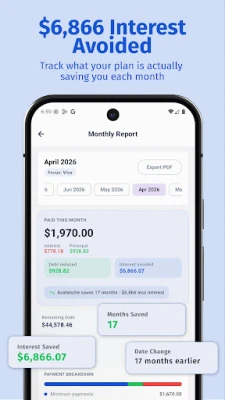 Every month, see how much interest you avoided, how much principal you paid down, and how many months closer you are to debt freedom. Export as PDF anytime.