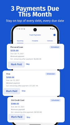 Your personal payment calendar shows every upcoming payment across all debts. Mark as paid, skip, or reschedule β your plan updates automatically.