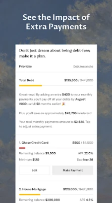 - Custom Payoff Plans: Choose from proven strategies like Debt Snowball, Debt Avalanche, or create your own custom plan.