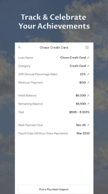 - Multi-Loan Support: Organize loans across categories, from credit cards and student loans to mortgages and auto loans.