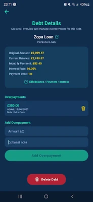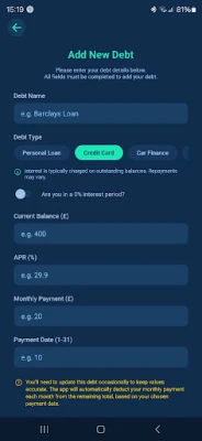 • Perfect for short-term debts: Track credit cards, personal loans, store cards, car finance (including PCP and HP), and more.