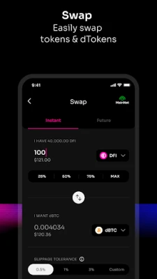 Seamlessly trade dTokens and crypto-assets on the DEX with the wallet. Supply liquidity to DEX pools like DFI-DUSD and more, and earn high yields while powering the decentralized exchange.