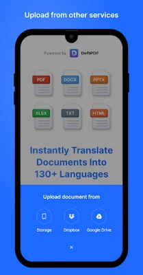 DeftPDF Document translation Instantly translates documents into 130+ languages. You can use our app to translate document in PDF, Docx, PPTX, CSV, ODT, ODS, ODP, Xlsx, Txt, and formats.