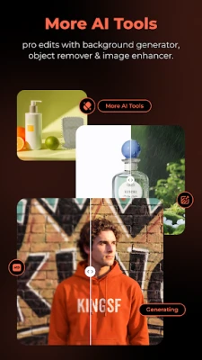• AI Background Generator — Create realistic lifestyle scenes from 500+ presets or simple text prompts.