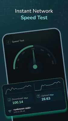 - Speed Test: Measures your device’s download and upload speeds in Mbps, and lets you visualize the speed results on a meter.