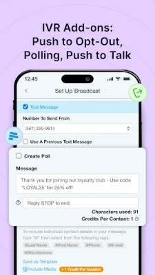 • Free to get started—send mass texts and voice calls to up to 25 contacts each week