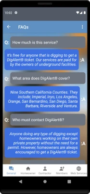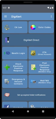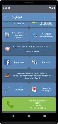 Keep yourself up to date with our latest advancements in technologies by downloading the DigAlert app with tons of useful tools for homeowners and contractors such as: - Access most DigAlert online services - Check and Post Positive Response - Renew, Remark and create new DigAlert Tickets - See all of your tickets that will be expiring or have expired - See if the center is open, closed and how many callers are on hold before you call - And Much more