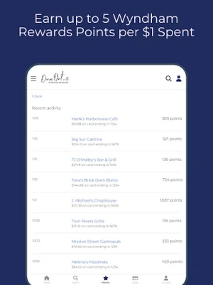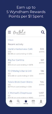 Earn up to 5 Wyndham Rewards points per $1 spent on dine-in and takeout orders from thousands of restaurants and bars nationwide with the Dine Out with Wyndham Rewards app. To start earning, simply join for free and link your most-used debit/credit cards and use them to pay your bill, leave a review, and earn points.
