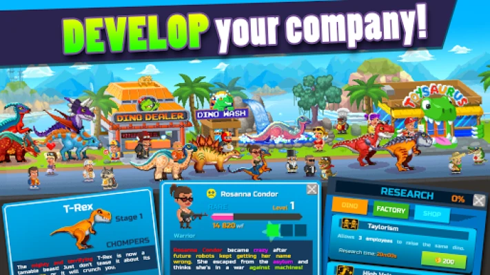 Expand your reputation, improve your factory and develop CRAZY dino-themed businesses to keep your customers happy: pet shops, riding schools, parks, arenas, and many more!